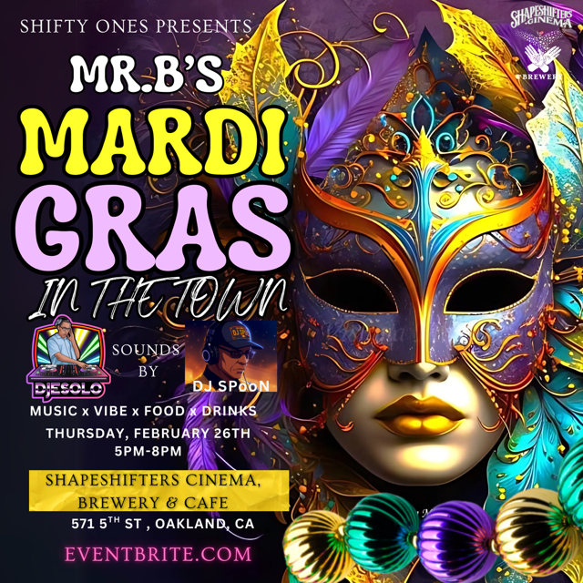 Mr. B invites you to celebrate Mardi Gras—Oakland-style—during SF Beer Week 2026 at his special pop-up event In the Town at Shapeshifters Café. Join us for some Louisiana-inspired sausage and seafood gumbo (vegan & gluten-free options also available) served with sweet corn cakes + two new beer releases from Shapeshifters Brewery, as well as music on the back deck spun by E-Solo and DJ SPooN.